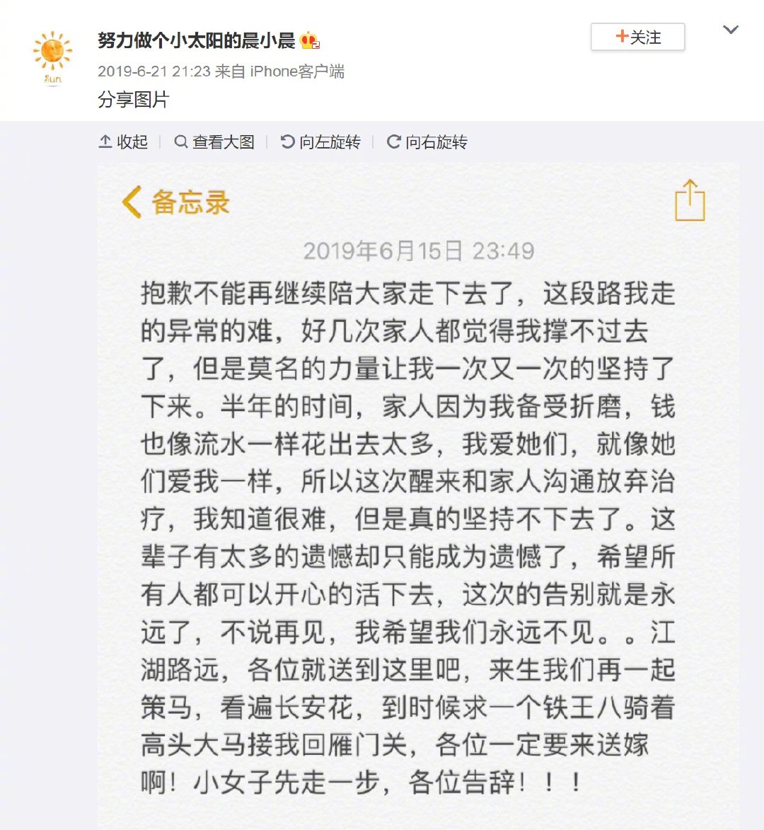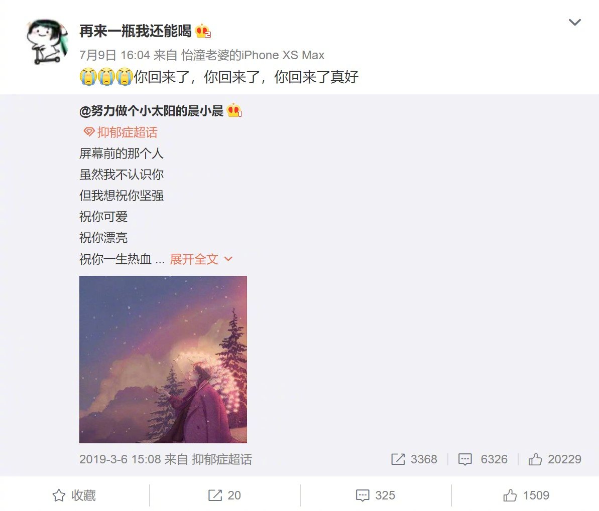 1、@努力做个小太阳的晨小晨 该账号2018年12月关注抑郁症并首次发博。2019年6月,在该账号唯一登录着的移动设备上发布疑似离世的帖文(见配图1),此后转为只刷微博不发言,直至今年3月在相同设备上发帖声称“回来了”。账号始终未发现被盗状况。