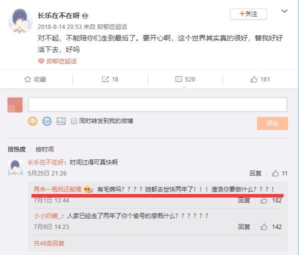2、在排查过程中,微博注意到,该设备上还登录有两个账号:@长乐在不在呀 和 @再来一瓶我还能喝。其中,@长乐在不在呀 亦曾经活跃在抑郁症超话,2018年8月14日发布疑似离世的帖文(见配图2)后,也转为只看不发言。