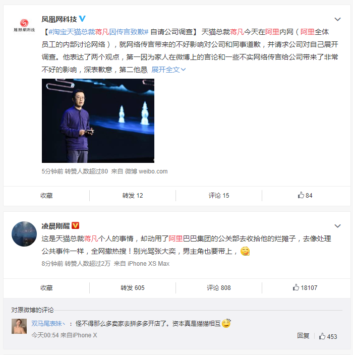 4月18日,据新浪科技报道,淘宝、天猫两大平台的总裁蒋凡已经在阿里内网道歉,并恳请公司对自己进行调查。