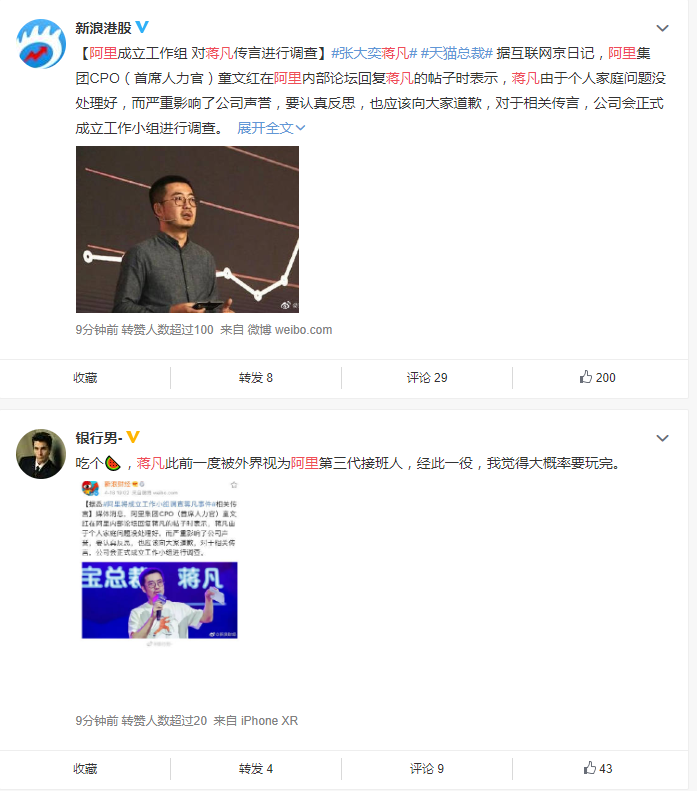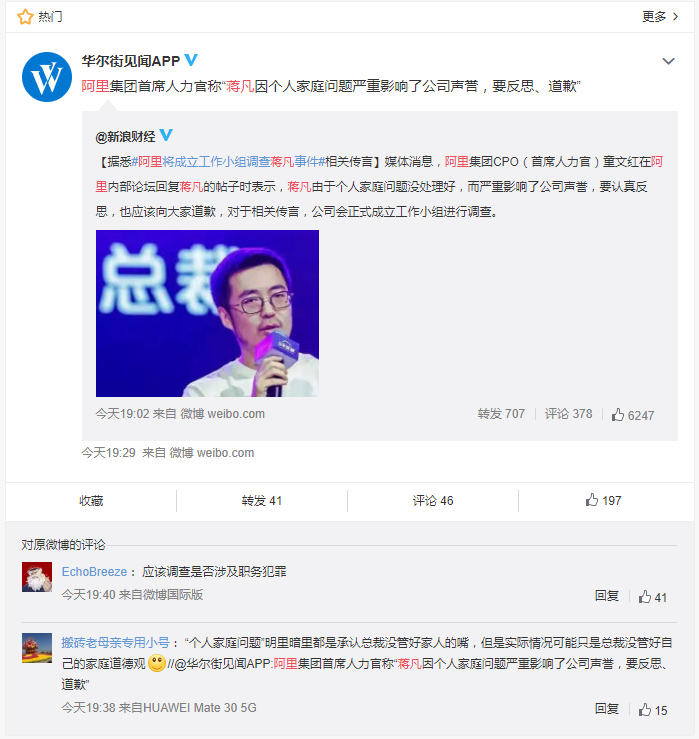 据悉蒋凡在阿里内网表达了两个主要观点,第一因为家人在微博上的言论和一些不实网络传言给公司带来了非常不好的影响,深表歉意,第二他恳请公司对自己展开相关调查。