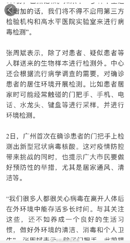广州市疾病预防控制中心副主任张周斌介绍,市疾控检测实验室目前的日检测量已经达到660份左右,已接近实验室的极限。检测样本来源于医院上送的排查标本,包括进行流行病学调查后密切接触者的标本,在对确诊病例的流行病学调查中,对居家环境中也会采外环境标本采集。
