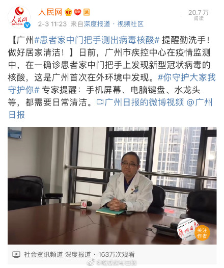 广州日报全媒体记者刚刚了解到,日前,广州市疾病预防控制中心在对新型冠状病毒的肺炎疫情监测中,在一名确诊患者家中门把手上发现了新型冠状病毒的核酸,是广州首次在外环境中发现,提示市民应更注意手卫生。