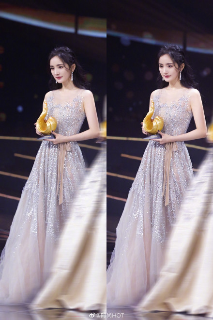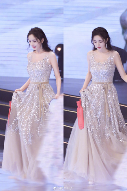 当晚杨幂身穿一袭裸色闪钻长裙,甜美梦幻,曼妙轻盈,粉丝大呼造型师可以加鸡腿了!
