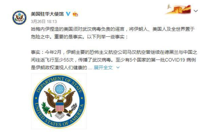 就在前两天,唐川普才扭扭捏捏的宣布不再继续使用“中国病毒”一词没多久(一如往常,他先制造了一个问题,然后用这个问题来讨价还价,最后又迅速地打破自己的承诺),在此之前一直使用WTO标准称呼的美国驻华大使馆官方微博一改常态,开始频繁使用起了“武汉病毒”这个词。