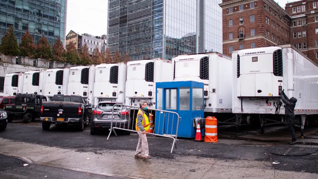 我的医生朋友告诉我——纽约市至少两家公立医院的太平间装不完尸体,有人在急诊室等床位的时候就病死了,州长出面要联邦应急管理署(FEMA)提供85辆冷藏卡车及负责殡葬服务的工作人员,你看这一字排开的冷藏车,这是一个个破碎的家庭,一个个逝去的生命啊。
