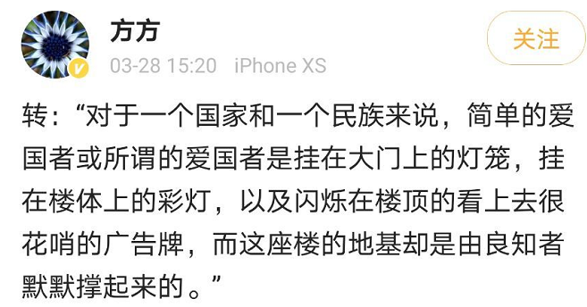 我国某著名作家方方曾经发出过灵魂之问:“我们是要做一个有良知的人,还是要做一个简单的爱国者?”“对于一个国家和一个民族来说,简单的爱国者是挂在大门上的灯笼,挂在楼体上的彩灯,以及闪烁在楼顶看上去很花哨的广告牌,而这座楼的地基是有良知者建立起来的。”