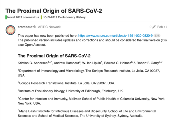 比如斯克利普斯研究所的著名病毒进化学家Kristian Andersen在virological.org发表文章,反驳了 “人工合成”阴谋论,文章已被众多著名病毒学家转载并支持。