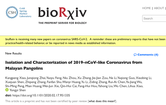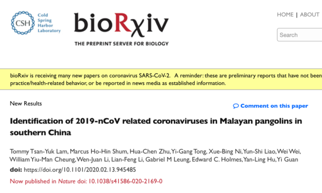 另外,华南农业大学、香港大学管轶教授与广西医科大学胡艳玲教授,都在预印本网站bioRxiv 发表研究论文(https://www.biorxiv.org/content/10.1101/2020.02.17.951335v1,https://www.biorxiv.org/content/10.1101/2020.02.13.945485v1),表明在穿山甲样本中发现了与COVID-19病毒类似的冠状病毒。
